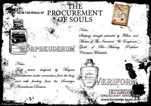 The next inventions up from The World of The Procurement of Souls are patented serums from The Inventors' & Engineers' Guild of Bio-Alchemy. Morpheuserum High strength sleeping draught designed by Fellow and Master of The Guild, Professor Clarence Malahide. Veriform This truth serum was designed by Baron Magnus Drinkwater under commission from... Continue Reading →