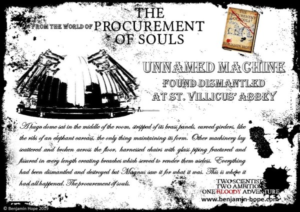 A huge dome sat in the middle of the room, stripped of its brass panels, curved girders, like the ribs of an elephant carcass, the only thing maintaining its form. Other machinery lay scattered and broken across the floor, harnessed chairs with glass piping fractured and fissured in every length creating breaches which served to... Continue Reading →