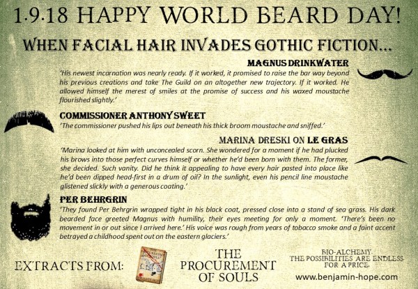 Well, as a self-confessed beardy of late (you can't deny it when it's on your face, after all!) I felt I had to mark World Beard Day this year. It would appear that I have endowed a number of my characters in The Procurement of Souls with a moustache at the very least! Here's a... Continue Reading →